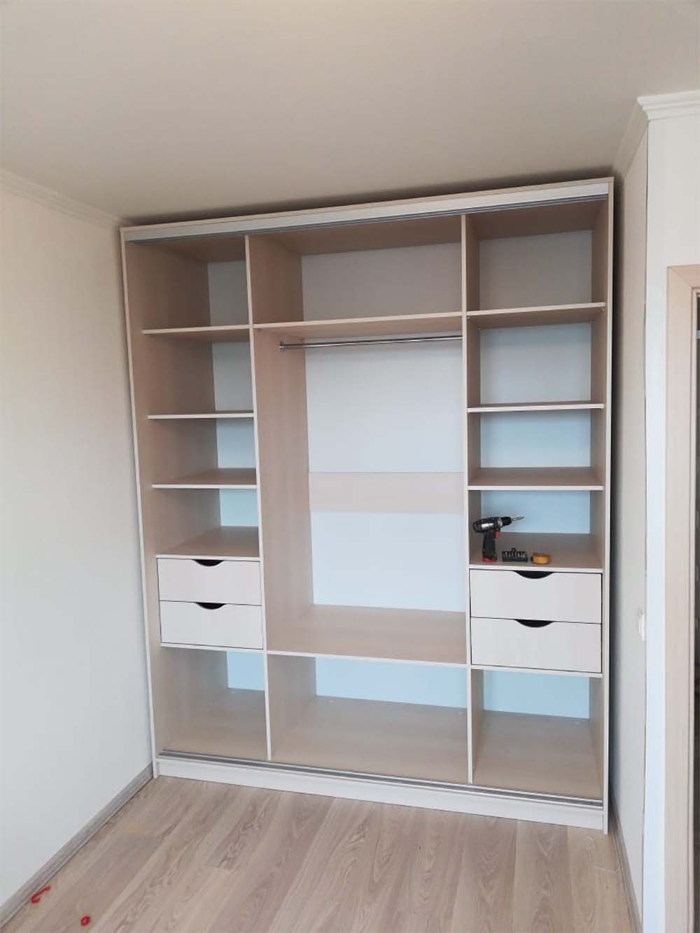 Индивидуально изготовленный шкаф-купе с зеркальными дверцами из материала корпуса, который легко и гармонично вписался в комнату. Зеркало визуально увеличило пространство, а недорогая цена удивила покупателя.